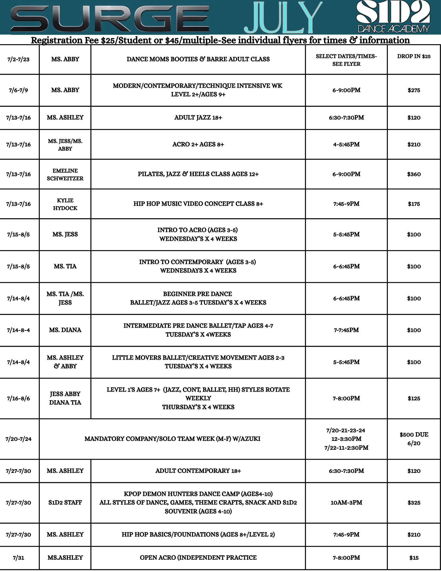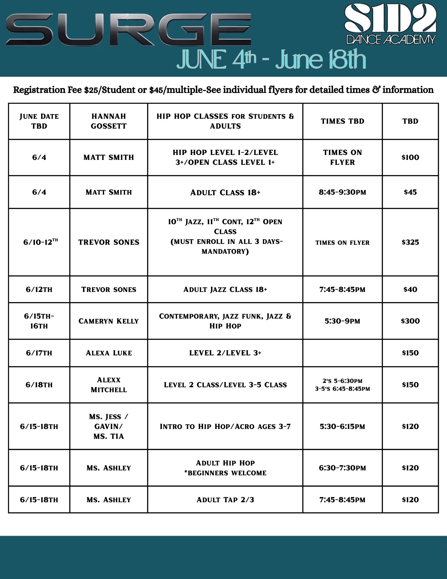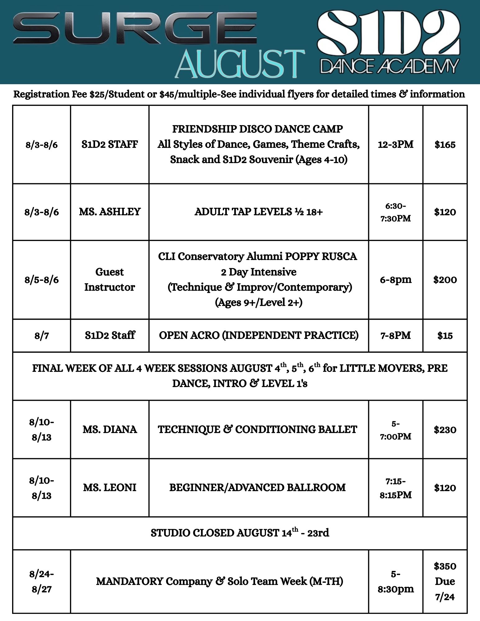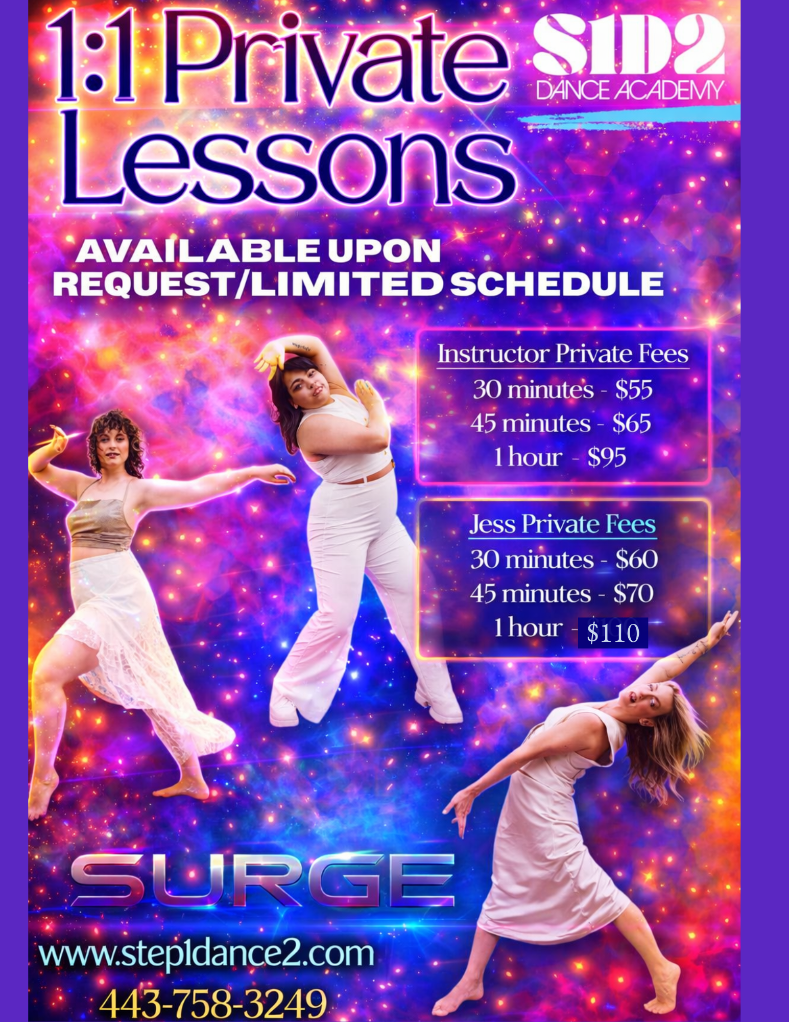 Plan your summer training with S1D2! We offer a variety of styles, guest classes, and private lessons (available upon request via email). Explore styles like ballroom, Broadway, hip hop, jazz, tap, acro, contemporary, ballet, choreography, improv, and more!